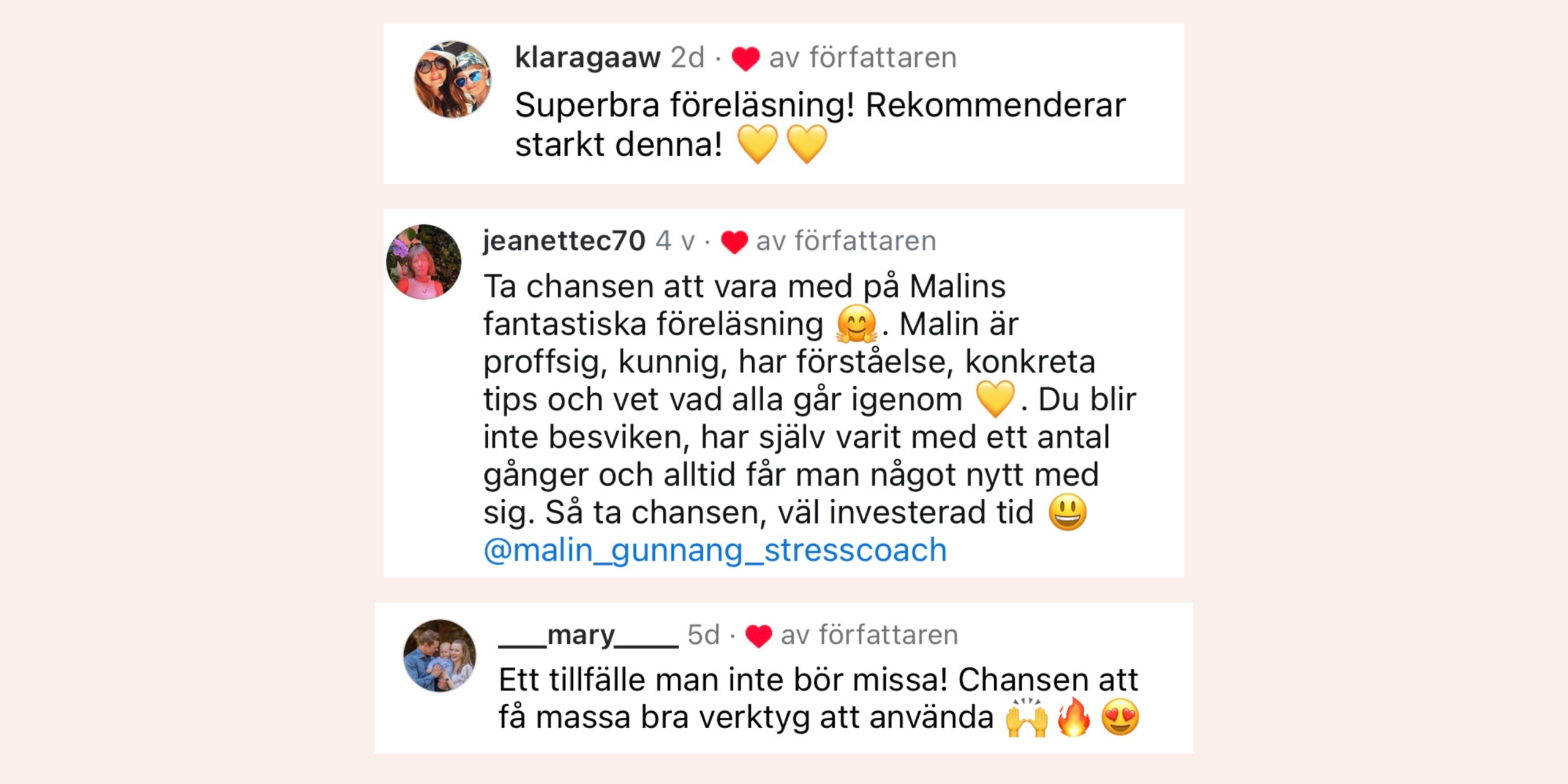 Föreläsningarna sker digitalt via zoom. Länk skickas direkt efter anmälan. Håll utkik även i skräppost/kampanjer. För eventuella frågor kan du alltid kontakta mig här www.malingunnang.com/kontakt